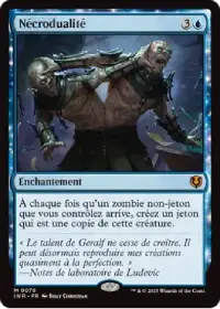 Nécrodualité crée une copie de chaque zombie non-jeton qui arrive en jeu sous notre contrôle. Elle permet de créer très rapidement une armée de zombies imposante pour déborder les adversaires.
