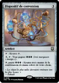 Dispositif de conversion fournit du mana incolore et peut accélérer votre sortie. En échange de 3 manas, vous pourrez produire 3 énergies par tour. À l'inverse, le Dispositif peut s'engager en payant 3 énergies pour vous donner 3 manas incolores et ainsi jouer vos cartes les plus chères.