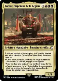 Caesar, empereur de la légion vous donne le choix entre 3 effets en sacrifiant une créature à chaque fois que vous attaquez. Vous pouvez créer 2 jetons 1/1 attaquants ou piocher une carte et perdre 1 pv ou infliger à l'adversaire ciblé un nombre de dégâts égal au nombre de jetons de créatures que vous contrôlez.