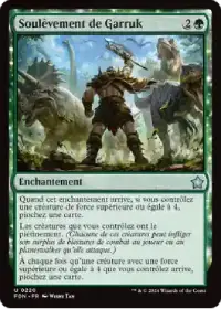 Soulèvement de Garruk vous fait piocher une carte lors de son arrivée en jeu et vous fait piocher à nouveau à chaque fois qu'une créature de force supérieur ou égale à 4 arrive en jeu sous votre contrôle. Il donne également piétinement à tous vos dragons.