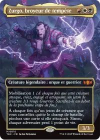 Zurgo, broyeur de tempêtes est une 3/3 pour 3 manas. Grâce à la capacité Mobilisation 1, il crée un jeton 1/1 guerrier engagé et attaquant à chaque fois qu'il attaque.