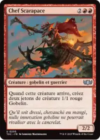 Elle crée 2 jetons gobelins 1/1 en arrivant en jeu et vous permet à chaque fois qu'elle attaque d'exiler autant de cartes que de jetons sous votre contrôle avec des noms différents. Vous pouvez jouer cette carte à chaque tour où vous avez attaqué avec un Commandant.