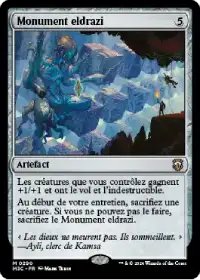 Monument eldrazi donne +1/+1, le vol et l'indestructible à toutes vos créatures. Les multiples jetons zombies créés par notre Commandant deviennent alors une véritable condition de victoire.