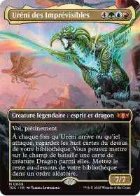 Uréni des Imprévisibles est une 7/7 avec le vol et le piétinement pour 7 manas. À son arrivée en jeu et lorsqu'elle attaque, vous regardez les 8 cartes du dessus de votre bibliothèque et vous pouvez mettre une carte de dragon parmi elles directement sur le champ de bataille.
