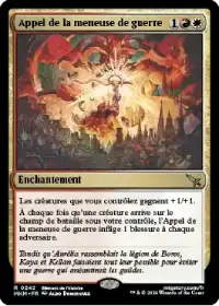 Appel de la meneuse de guerre inflige une blessure à chaque adversaire lorsqu'une créature arrive sous notre contrôle, en plus de booster l'ensemble de nos créatures de +1/+1.