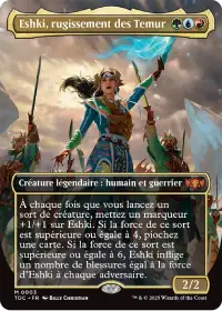 Eshki, rugissement des Temur est la Commandante alternative de ce deck. Elle gagne un marqueur +1/+1 à chaque fois que vous lancez un sort de créature.