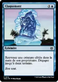 Claquement vous permet de renvoyer une créature dans la main de son propriétaire avant de dégager 2 de vos terrains. En plus de gérer temporairement une créture adverse ou de sauver l'une des votres, ce sort virtuellement gratuitement vous laisse tous vos manas à disposition pour lancer votre 2ème sort.
