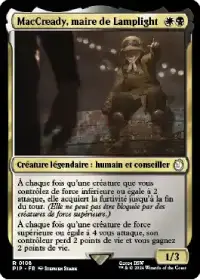MacCready, maire de Lamplight donne la furtivité à toutes vos créatures et empêche votre adversaire de bloquer avec des créatures de force supérieure. La plupart de vos créatures ont 0 en attaque et deviennent donc très difficiles à bloquer, vous permettant ainsi de vous lancer dans des attaques dévastatrices.