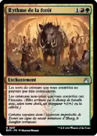 Rythme de la forêt rend tous vos sorts de créatures incontrables et leur donne l'émeute. Vous pouvez notamment les faire arriver en jeu avec la célérité, ce qui les rend bien plus menaçants et vous permet de déclencher la capacité de votre Commandant une 2ème fois le tour où il arrive en jeu.