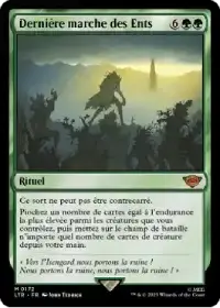 Dernière marche des Ents vous fait piocher autant de cartes que l'endurance la plus élevée parmi vos créatures, avant de vous permettre de poser directement en jeu autant de créatures que vous le souhaitez depuis votre main. Avec les endurances élevées présentes dans votre deck, voilà de quoi totalement déborder vos adversaires.