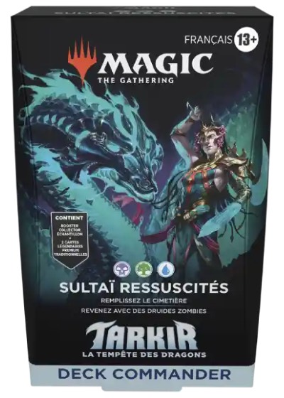 Sultaï Ressuscités est un deck Noir / Vert / Bleu avec de nombreuses synergies autour du cimetière. Son Commandant, Teval, ramène des terrains en jeu depuis le cimetière et nous récompense d'un jeton 2/2 zombie et druide à chaque fois qu'une carte quitte le cimetière.