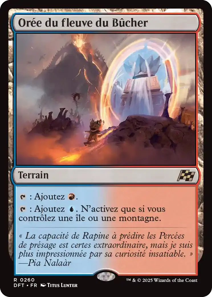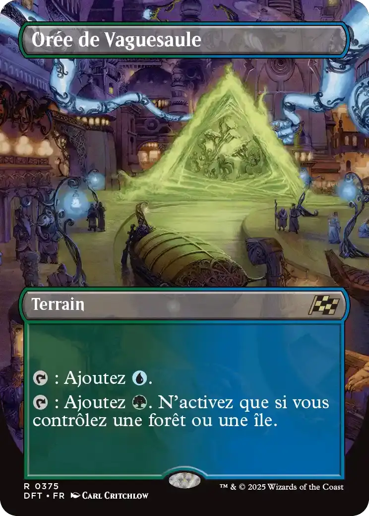 Débuté avec l'édition Mornebrune, le cycle des 10 double terrains Orées est désormais complet. Ces terrains arrivent en jeu dégagés et peuvent produire une seconde couleur de mana en fonction des terrains de base que vous contrôlez.