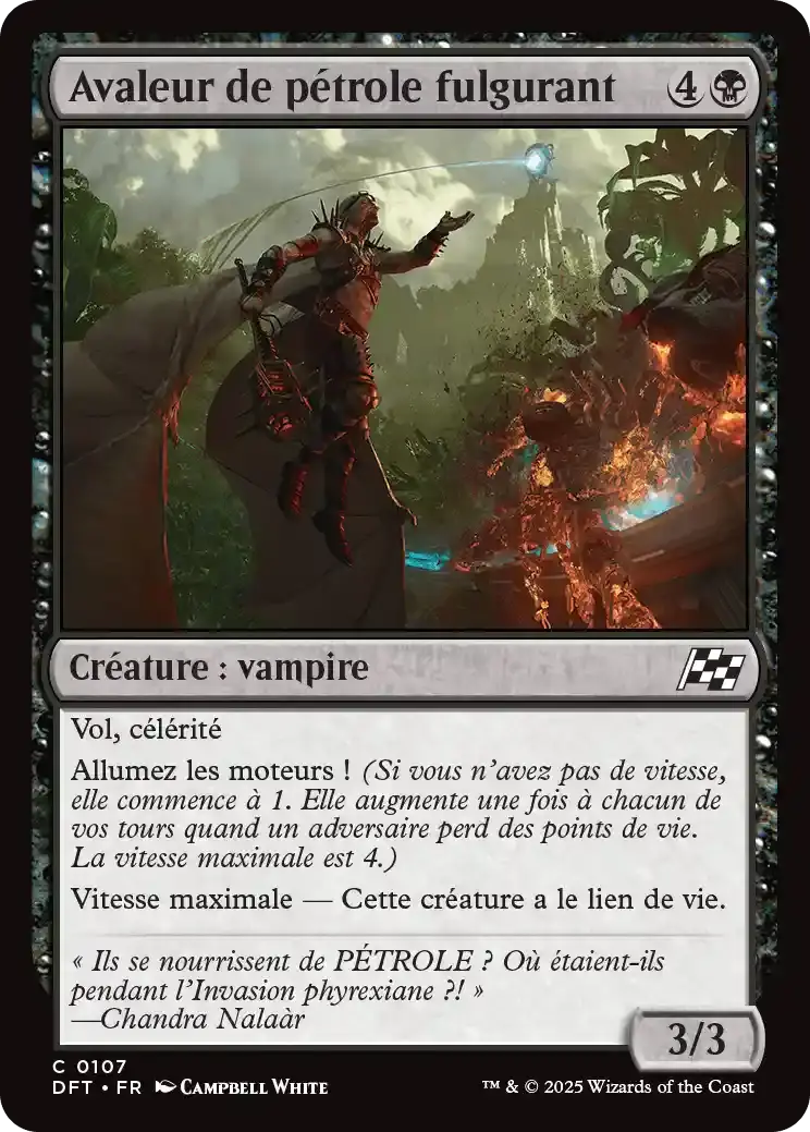 Lors d'une partie, la première fois que vous contrôlez un permanent avec Allumez les moteurs !, votre vitesse passe à 1. Cet effet se produit immédiatement et aucun joueur ne peut y répondre pour gérer ce permanent avant que votre vitesse ne passe à 1.