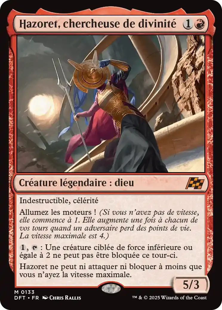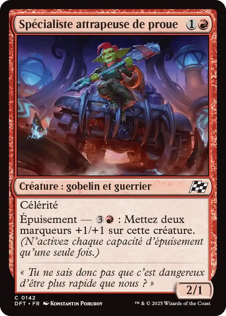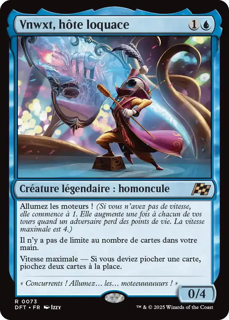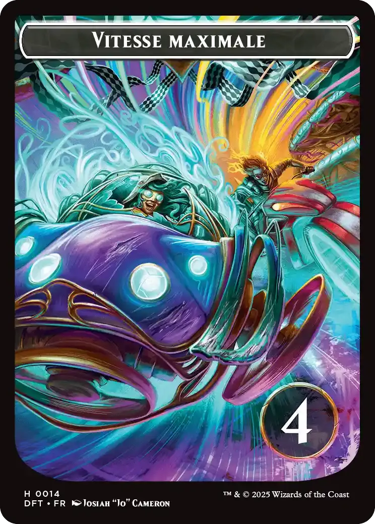 Vous trouverez dans les boosters Aetherdrift des cartes recto verso qui vous permettent de garder une trace de votre vitesse et d'avoir à l'œil le texte de la capacité déclenchée.