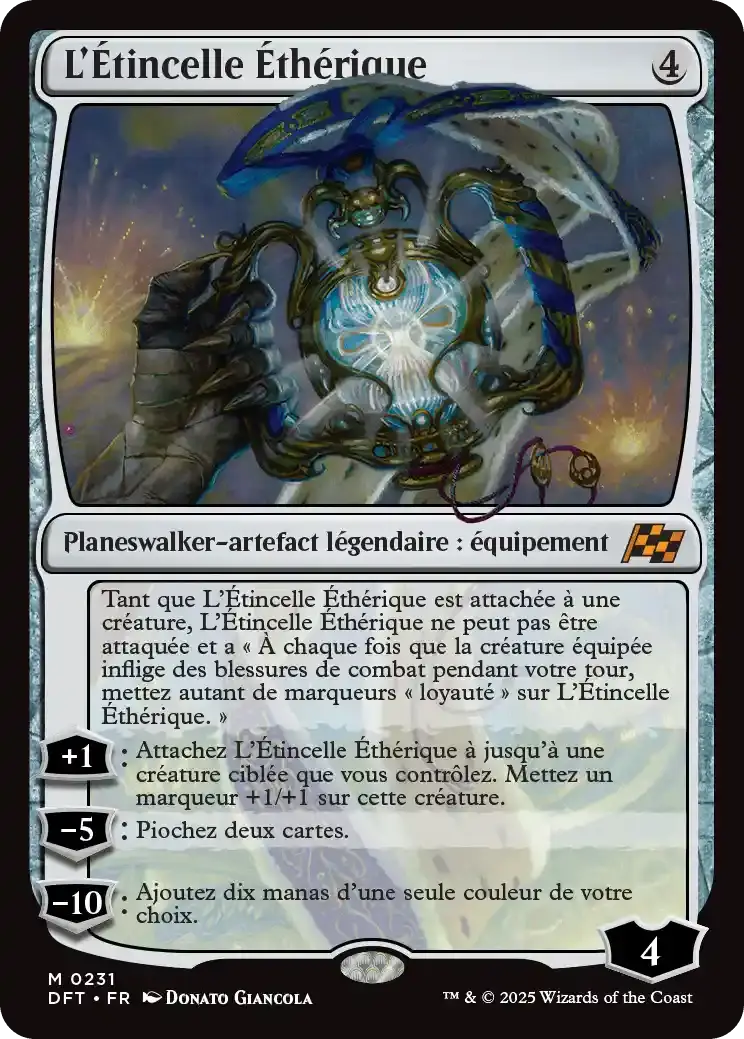 En tant que carte, L'Étincelle Éthérique possède un type inédit dans l'histoire de Magic. C'est un Planeswalker-artefact légendaire qui fait également office d'équipement.