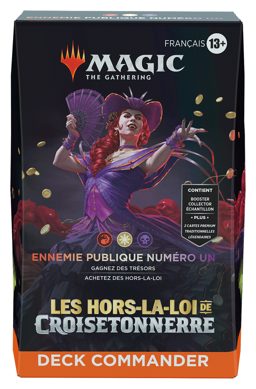 Ennemie publique numéro un est un deck Rouge / Blanc / Noir mené par Olivia, hors-la-loi opulente. Basé sur la mécanique hors-la-loi, il vous permet de créer de nombreux trésors qui peuvent être utilisés pour accélérer votre sortie, ou pour booster vos créatures.