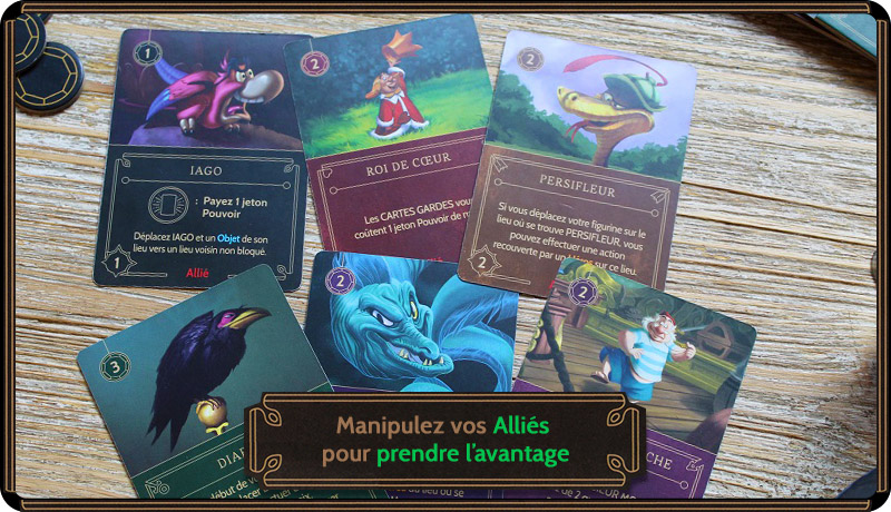 Utilisez vos cartes Alliés pour vaincre les Héros et libérer des lieux de votre Royaume. Certains d’entre eux sont uniques et essentiels, comme Iago ou Persifleur, tandis que d’autres font office de sbires, comme les Gardes du Prince Jean.