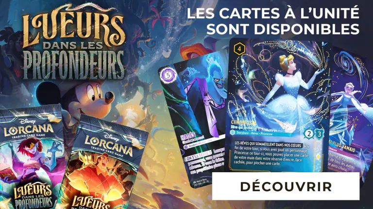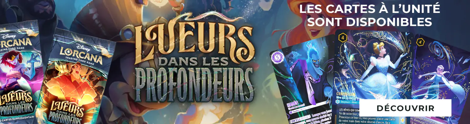 Découvrez le prochain chapitre de Lorcana, Lueurs dans les Profondeurs, avec de nouvelles cartes, de nouveaux personnages disney, des mécaniques de jeu inédites et des raretés toujours plus brillantes et incroyables !