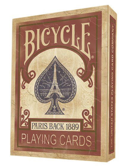 Contenu : Paquet de 54 cartes à jouer "Paris 1889 dos rouge" de la marque américaine Bicycle. Étui cartonné, Cartes stylisées. Dimension d'une carte : 88 x 63 mm (format Poker).